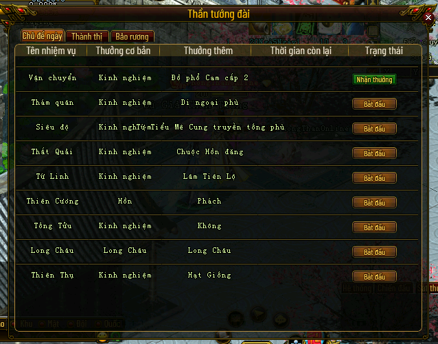 Sau khi Thần Tướng hoàn thành nhiệm vụ được giao, anh hùng nhấn vào nút “Nhận Thưởng” để trả nhiệm vụ và nhận phần thưởng.