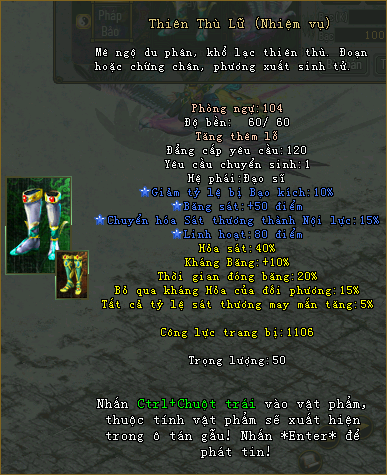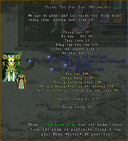 Trang bị Hoàng kim là bảo vật mà chỉ các bậc anh hùng chân chính mới xứng đáng sở hữu. Phong Thần Origin lần đầu tiên giới thiệu 3 bộ trang bị Cửu Tuyệt, Thiên Thù, Vô Tần với các chỉ số và thuộc tính mạnh mẽ giành riêng cho mỗi hệ phái. Hãy tham gia ngay để sở hữu bộ trang bị Hoàng kim và khuynh đảo tam giới.