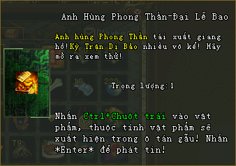 Đừng quên mở “Anh Hùng Phong Thần - Đại Lễ Bao” mỗi khi thăng cấp để tận hưởng thành quả tu luyện của mình với các phần thưởng: Thú Cưỡi, Trang bị Lục, Vũ Khí Hoàng Kim, Quái Phù, Đồ Phổ Cam Phá Quân (tự chọn), ngoài ra các bảo vật trong Bát Bảo Các cũng nằm bên trong túi quà này.