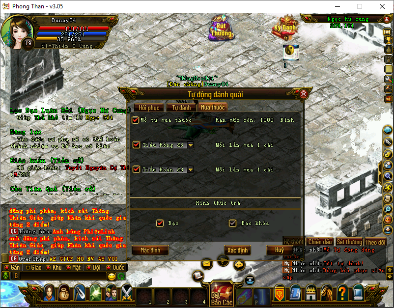 Các Anh Hùng có thể cài đặt các vật phẩm cần mua và hình thức trả, sau đó kích hoạt chức năng bằng cách đánh dấu vào “Mở tự mua thuốc”.