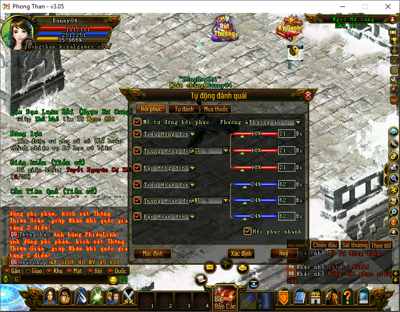 Hoặc sử dụng chức năng “Hồi phục nhanh” hệ thống sẽ tìm kiếm tất cả vật phẩm hồi phục sinh lực/nội lực khi sinh lực/nội lực dưới 50%.
