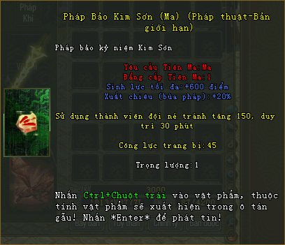 Lễ bao Pháp bảo Kim Sơn (Tiên Ma) mở ra có thể chọn nhận 1 trong các loại pháp bảo sau: