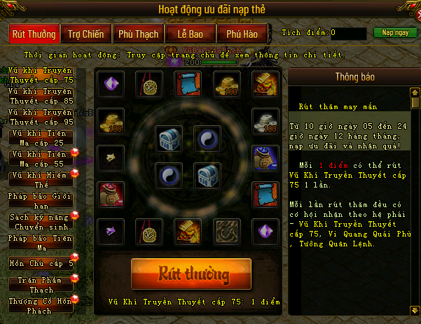 - Trong thời gian diễn ra sự kiện, mỗi khi nạp 01 Thông Bảo (100 Xu) sẽ nhận được 1 điểm tích luỹ.